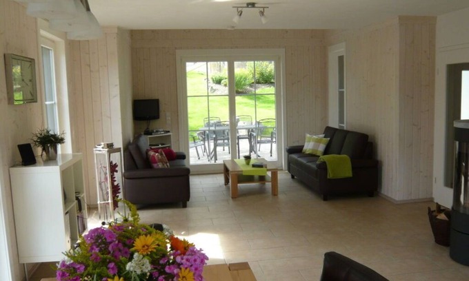 New holiday home in close proximity to the ski slopes, amusement park and hiking routes for up to 7 people with 135m² of living space. The house is suitable for asthmatics and allergy sufferers; the ground floor is barrier-free. The facilities include a living room with a fireplace, satellite TV, VD player, stereo CD and radio system. Telephone and internet access free of charge, a fully equipped kitchen as well as a single and 3 double rooms that can be completely darkened and equipped with insect screens. There is a sofa bed in the family bedroom. There are 2 bathrooms with shower and toilet, one of which is wheelchair accessible. Large bathroom with bath and shower and two individual sinks. Enjoy your vacation on the terrace (facing west) with a fireplace and barbecue facilities.
