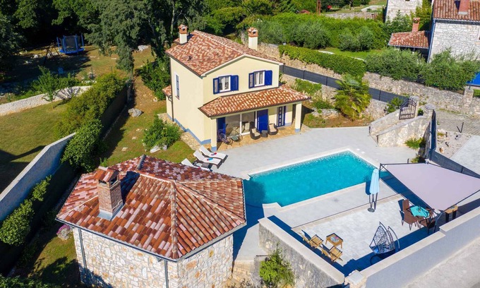 The detached holiday home built in 2016 and is furnished in a modern style. The property is located on the outskirts. Also due to its quiet and sunny location the domicile is popular. Available for your exclusive use: sunbathing lawn, parasol, sun lounger, children's playground, swing, garden shower, barbecue facilities, terrace, pavilion, garden furniture and campfire site.LocationKršan. The holiday home is located on a 900 sqm enclosed garden plot with flowers and shrubs. The landlord does not live in the house or on the property. Access is via a path (asphalted). Parking is available on the property. Specialair conditioning.Facilities: internet access (WLAN) and washing machine. TV reception takes place via satellite. PoolAll pools are available for exclusive use. Outdoor pool (usable from early May to early November, 10 m x 4 m, depth 1,5 m). Dogsnot allowed. DistancesShopping 2 km, restaurant 2 km, town center 2 km. In summer: Adriatic Sea 6 km in Plomin (beach 6 km in Plomin featuring stones, rocks and bathing plateaus). fishing in Plomin 6 km. tennis, mini golf, diving, boat rental, boat launch each 15 km in Rabac. DivisionHoliday home, 2 floors, 3 rooms (including 2 bedrooms), 90 sqm, in total 4 beds. RoomThe entrance to your holiday home is located on the ground floor.Ground floor: Living/bedroom with 2 additional beds, sitting area, TV and access to the terrace. Cooking nook with electric stove (ceramic hob, 4 plates), oven, extractor hood, dishwasher, fridge (icebox), microwave, coffee machine, toaster and electric kettle. Separate toilet with 1 washbasin, WC and window. 1st floor: 2 bedrooms each with 1 double bed. Bathroom with washing machine, shower, 1 washbasin, WC and window. Bathroom with shower, 1 washbasin, WC and window. Terms of lease and pricesIncluded in the priceOutdoor pool, internet access, air conditioning, parking place, electricity, gas, water, final cleaning, sunloungers, Bed linen (weekly change), Wireless Internet access. Side costs-Additionally(Payable when booking)/local tax.Deposit:EUR 200,-/object.