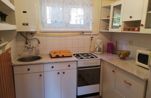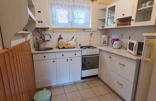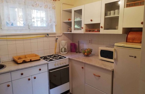 The detached holiday home is furnished in a functional style. The property is located in a holiday home settlement, in the town centre. Also due to its quiet and sunny location the domicile is popular. Available for your exclusive use: sunbathing lawn, parasol, barbecue facilities, terrace and garden furniture.LocationZalakaros. The holiday home is located on a enclosed garden plot with meadow, flowers, shrubs and trees, bordered by a fence. The landlord does not live in the house or on the property. Quiet, green location Access is via a side road (asphalted). Parking (for 1 car) is available on the property. SpecialFacilities: internet access (WLAN) and iron. TV reception takes place via satellite. TV programme in DEFor your safety, the accommodation is equipped with smoke detector. Dogsallowed, EUR 5.00/pet per day. DistancesShopping 200 m, restaurant 150 m, town center 200 m. thermal bath in Zalakaros 300 m. Sármellék Airport 18 km. Bus stop 130 m. In summer: fishing in KisBalaton 8 km. DivisionHoliday home, 2 floors, 3 rooms (including 1 bedroom), 50 sqm, in total 4 beds. RoomThe entrance to your holiday home is located on the ground floor and leads over the 15 sqm terrace directly into the living room.Ground floor: Living room with sitting area, TV, dining area (4 seats) and access to the terrace (9 sqm, covered, garden furniture). Kitchen with gas stove, oven, fridge (icebox), microwave and coffee machine. Bathroom with shower, 1 washbasin and WC. Upper floor: Bedroom with 1 double bed. Eat-in kitchen with 2 single beds. Separate toilet with WC. Mietbedingungen und PreiseIm Preis bereits enthalteninternet access, parking place, electricity, gas, water, final cleaning, bed linen, Welcome drink, Wireless Internet access. Side costs-Frais sur site:/Obbligatorio:local tax by local tariff.A scelta:heating 2 € per object per day (28.03.26-25.04.26).Waarborgsom:EUR 50,-/object.