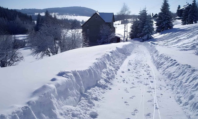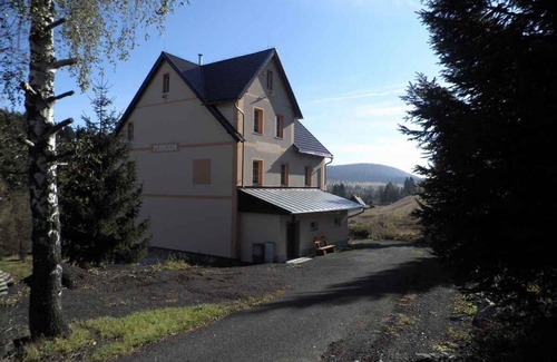 The detached holiday home is furnished in a modern and functional style. The property is located at the end of a cul-de-sac road, in a holiday home settlement. Also due to its quiet and sunny hillside location at the edge of the forest the domicile is popular. Available for your exclusive use: sunbathing lawn, barbecue facilities and campfire site. Cooler for drinks. Each bedroom has a bathroom. For grilling portable grill is available.LocationAbertamy - Hrebečná, 850 m above sea level. The holiday home is located on a 7000 sqm open garden plot with meadow. The landlord does not live in the house or on the property. Bed linen please order with booking. Access is via a side road (asphalted, length 250 m). Snow chains are recommended in winter. Parking (for 4 cars) is available on the property. Specialcentral heating (gas).Facilities: baby cot and internet access (WLAN). TV reception takes place via satellite. Leisurebilliards. Dogsnot allowed. DistancesShopping 2 km, restaurant 50 m, town center 2 km. In summer: tennis in Merklín 8 km. In winter: Ski lift 2 km in Pernink. Ski area 4 km in Pernink (Ski area Pernink). ski rental, ski school each 4 km in Pernink. Cross-country ski run on site - Erzgebirgs-Magistrale. Ski centre Bozi Dar at 8 km. DivisionHoliday home, 3 floors, 8 rooms (including 7 bedrooms), 300 sqm, in total 23 beds (including 1 additional bed). RoomThe entrance to your holiday home is located on the basement, is at ground level and leads directly into the porch with wardrobe and sitting area.Ground floor: Common room (50 sqm) with sitting area, TV, fireplace and dining area (20 seats). Kitchen with electric stove (4 plates), oven, extractor hood, dishwasher, fridge (icebox) and electric kettle. 1st floor: Bedroom (walk-through room) with 4 single beds and 1 additional bed on bunk bed (upstairs). Bedroom (walk-through room) with 1 double bed. 2 bedrooms each with 1 double bed. Kitchen with electric stove (4 plates), oven, extractor hood, fridge (icebox) and electric kettle. Bathroom with shower, 1 washbasin and WC. Bathroom with washing machine, shower, 1 washbasin and WC. 2nd floor: Bedroom with 3 single beds. Bedroom with 4 single beds. 2 bathrooms each with shower, 1 washbasin and WC. Bedroom. Terms of lease and pricesIncluded in the pricebabycot, internet access, parking place, water, Wireless Internet access. Side costs-Costs on the spot:/Obligatory:electricity 0,80 € per kilowatt hour based on usage. gas 1,50 € per cubic meter based on usage. final cleaning 50 € per object per stay. hand towels to bring along. local tax by local tariff.On request:chimney wood 16 € per package based on usage. Bed linen (please order at booking) 6 € per person per first time use and changing.Deposit:EUR 200,-/object.