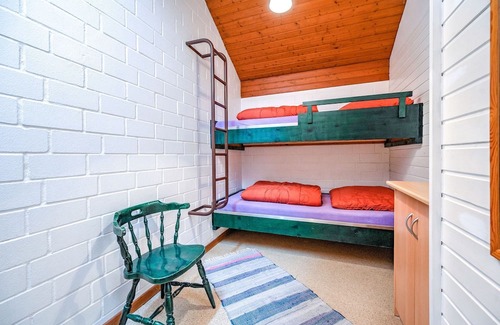 Layout: Ground floor: (Entrance, hallway, Living room(TV(satellite), fireplace), open kitchen(electric kettle, toaster, cooker(4 ring stoves, electric), coffee machine(filter), combination microwave, fridge(+ freezer)), bedroom(bunk bed(90 x 200 cm)), bathroom(shower, washbasin, toilet)) On the 1st floor: (bedroom(double bed(180 x 200 cm)), bedroom(bunk bed)) tumble dryer(shared with other guests, paid), washing machine(shared with other guests), heating(electric, central), terrace(20 m2), garden furniture, BBQ(charcoal), parking, parasol, sand pit, play equipment, children's bed, high chair