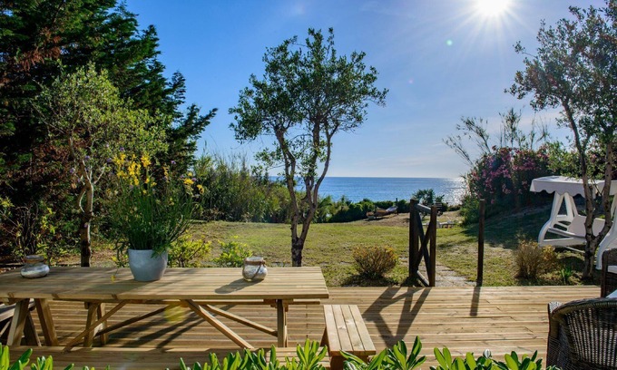 The villa is located directly on the beach of Spiaggia delle Saline, which can be reached through the garden gate. You can also enjoy the view of the sea from the beautiful wooden parquet veranda whose colour matches the green nature of the Mediterranean surrounding the villa. In the garden there is a quiet atmosphere where you can relax in the hammock or in the rocking chair while sunbathing. At sunset, the sun offers unique shows that plunge into the sea and colour the sky and the sea in a thousand shadows.