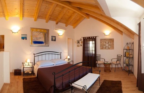 Capacity of the villa is ideal for a family, and capacity is 4+2 beds. Additional beds are on the ground floor. Villa has 3 floors, on the ground floor there is pleasant and comfortable living room, dining room, kitchen and WC. Interior and exterior stairs will take you up to the first floor with a terrace with a beautiful view over surrounding vineyards, olive groves and pine forests. On the first floor there is a spacious twin bedroom with comfortable bathroom. Interior stairs take you up to attractive attic with a bedroom with a double bad, spacious bathroom and wardrobe.