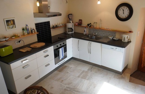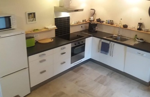 Lovingly restored (2013) forge from 19th Century. With private courtyard (150 square metres) and entrance for the car. In the ground floor (stone tiles) there is a living room and a dining room with the kitchen and access to the terrace. The living room is equipped with a TV (German and French channels) and a chimney stove. In the 1st floor is a bathroom, seperate WC and 2 bedrooms. One of the bedrooms with a French double bed (140 cm wide), another with 2 single beds (ever 90 cm wide). In the background of the court joins a fruit-tree meadow