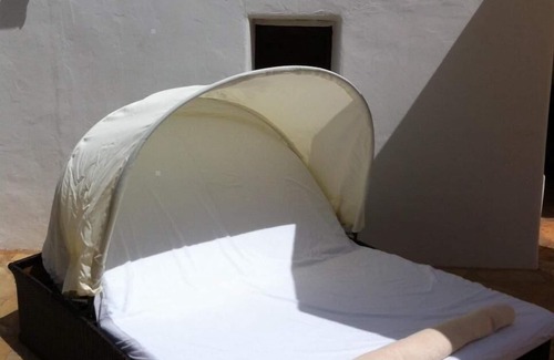 The holiday home, which was built in the 19th Century, is one of the traditional houses in the village of San Carlos. It was completely renovated in 2000, but has lost neither its authenticity nor the traditional charm of a country house on Ibiza. The house has two floors. On the upper floor is the 100-square-metre suite, where there is a bedroom with a large double bed, a bathroom with a Jacuzzi and a small living room with a sofa bed as well as its own large balcony. The other two bedrooms are approximately 14 square metres in size, and each has two double beds. In addition, there are two further bathrooms with bathtub or shower. The living room is equipped with a flat-screen TV, DVD player and a music system as well as cosy armchairs. The 35 sqm kitchen is fully equipped with a dining table and chairs, and invites you to cook or dine together. A small separate utility room with washing machine, tumble dryer and ironing board are also available. You have access to free WLAN throughout the whole house.