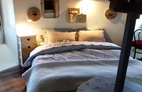 In the 2nd floor is the living room with sofa, small table, double bed, satellite TV and the old windmill mechanic.