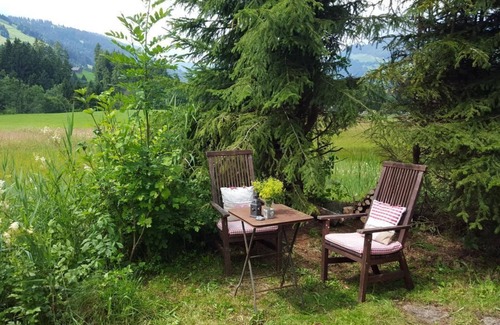 This romantic Toggenburg cottage is idyllically situated at the source of the Thur, with a view of the Churfirsten. Bright, friendly rooms with shabby chic style furnishings. The house is surrounded by a covered seating area at the entrance, a sun terrace on the south side, a separate barbecue area, 4 parking spaces and 2500 m2 of surrounding land (Riet area). On the ground floor is the cosy living/dining area and the open kitchen with coffee corner. Next to the master bedroom with double bed is the children's playroom or baby room. The house is heated by underfloor heating and the efficient Swedish soapstone stove. Simple shower/WC. Entrance hall with wardrobe and shoe racks. Upstairs there are two 2-bed rooms and a small, neat single room. WC and shared lavabo. Very quiet location with a direct view of the Churfirsten. Nevertheless centrally located with the ski bus 70 metres from the house during the season. The house is ideal for family or even 3 generation holidays. There is also room for up to 4 people in our Studio Chic, which can be found under holiday flats. In the snow in front of the house you can see tracks of deer, foxes and squirrels and if you are lucky you can watch the animals from the house.