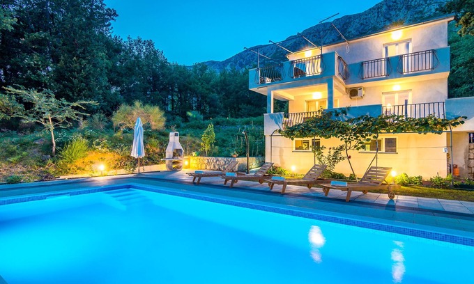 In a beautiful little place called Gata, situated at the foot of the mountain, just 5 kilometers from the sandy or pebbled beach and 27 kilometers from the city of Split we are offering you a house for 8 people with a private pool, outdoor grilling area, private parking, 4 bedrooms, 3 bathrooms, 2 fully equipped kitchens, 2 spacious dining areas and 2 large terraces overlooking the mountains. Our house is also located near the canion of the river Cetina where you can participate in outdoor activities such as hiking, biking and rafting or make a one day trip by car to National park Krka, National park Plitvice lakes, city of Dubrovnik, Trogir, Hvar... Separate yourself from noise and flurry of a big city and enjoy in stillness by the pool.