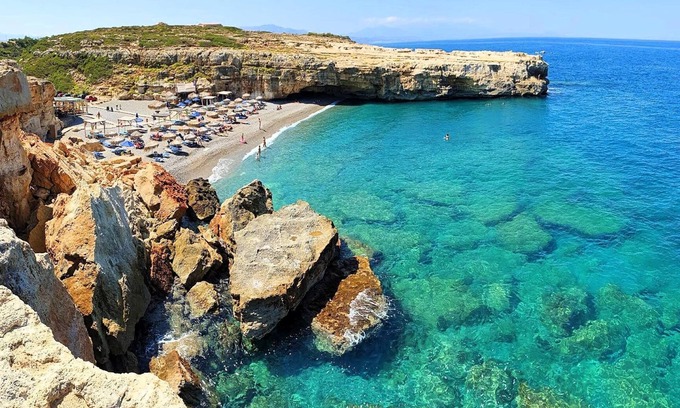 The rocky part of the coastal area boasts a number of caves, the Poseidon cave being the most important among them, to which access is possible from the sea only. Inside, bizarre formations of stalactites and stalagmites, reflecting the whole spectrum of colours, indeed display a "divine picture". At the entrance of the Poseidon cave, a huge stalgmite in the shape of a lion seems to watch over the enormous cave. Next to it, a peculiar accumulation of rocks could have been the "gate of the nymphs", under which the mermaids prepared themselves before they entered the cave of the great god of the seas.