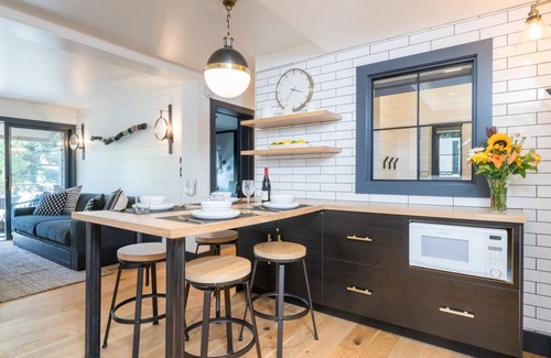 Airy and modern, this single-story condo boasts hardwood floors, radiant heat, and ample natural light. Inside, hooks wait by the door for guests to drop off coats and bags. The great room opens into a contemporary kitchen with a striking black-and-white color scheme and a tray ceiling. The spacious layout and 4-stool breakfast bar make it easy to sip après-ski drinks while crafting a homemade feast. The opposite side of the room encompasses an intimate living space with a wood-burning fireplace. Set the mood for a chill night by playing music over the Sonos speakers or sink into the plush couch with popcorn and wine for a movie marathon on the Smart TV, equipped with multiple streaming services. A built-in bench tucked in the windowed corner offers a charming spot to curl up with a book and enjoy the nature view. Step out the sliding glass door to relax on the balcony’s wicker loveseat—a perfect place to catch the sunset while surrounded by aspen trees. Freshen up clothes and gear with the stacked washer and dryer in the hall. When bedtime arrives, guests can retire to the primary bedroom with an inviting queen bed. For additional sleeping accommodations, there’s a private bunk nook with a twin-over-twin bed and reading lamps.