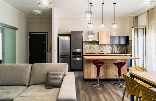 The apartment, completely brand new, has a modern open space of about 45 sqm with adjoining balcony, 52-inch flat screen TV, a wooden table for up to 12 people and a fully equipped kitchen with all accessories needed (oven, coffee machine, American coffee maker, kettle, etc.).