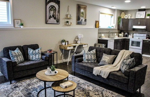 Relax on the private deck for fresh air with rocking chairs that face an open field or relax on the couch watching the Amazon fire TV with countless channels and shows to choose from. There are two bedrooms with very comfortable queen beds and touch lamps for easy on and off while reading your favourite book before bed. There are books provided in each room for your enjoyment as well. There is a four piece bathroom where you can relax and have a nice hot soak if desired. The kitchen is spacious and has everything you need to cook a delicious meal, bake your favourite treats or order in your favourite takeout from the many amazing restaurants Grande Prairie has to offer. You also have your own laundry so you’re not taking home dirty clothes. You will have access to two parking spots on the property.