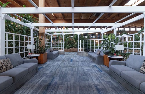 Guests can swim in the indoor pool. The hotel also features indoor tropical gardens.