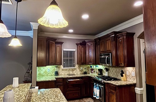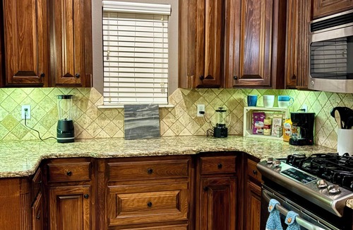 Inside, the home features soft modern décor with Southern touches — from the stylishly furnished living room to the inviting primary suite with its spacious ensuite bath and soaking tub. The open floor plan makes it easy to spread out and settle in, while the kitchen is equipped for everything from meal prepping to hosting.