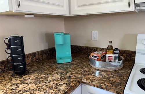 KITCHEN: Fridge, stove, oven, dishwasher, microwave, cooking basics, spices, coffee maker, blender, toaster, paper towels/trash bags.