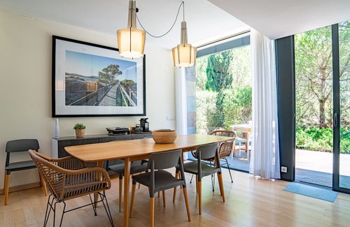 Inside, the soft color palette of décor, the wooden furniture, raffia and traditional basketry give the house the unique character of the region. Large floor-to-ceiling windows allow plenty of luminosity.