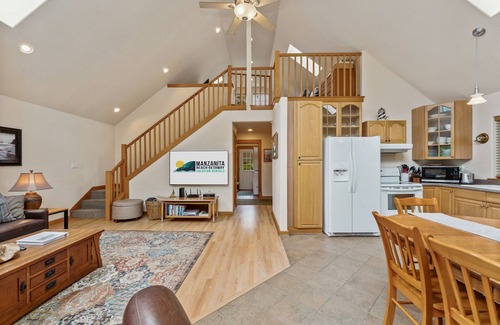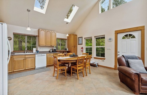 Featuring an open floor plan, you'll find a spacious living room, kitchen, bathroom, and both bedrooms on the main floor. Skylights throughout the home let in lots of natural light, even during rainy days. Gorgeous hardwood floors flow throughout the living area with plenty of comfortable seating. The spacious and well-equipped kitchen is the perfect place for those cooks in the family. Enjoy your meals at the dining room table that seats up to six, plus a nearby bar that seats two more if needed. There's even a felt poker table for hosting a fun night of cards!