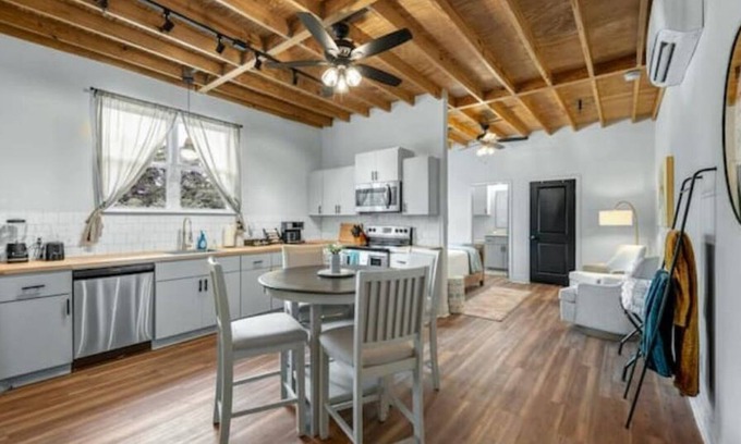 This spacious studio style second floor apartment is great for a couple with children. The couch opens to a full-size bed. Easy walking distance to downtown and the historic Kyle House, home of Polite Coffee company with its coffee uniquely roasted in Bryan. Together with The Hideaway and The Magnolia Bloom apartments a family could have the entire second floor landing to themselves. A fully equipped kitchen and an in-apartment washer and dryer make this more than a sleepover.