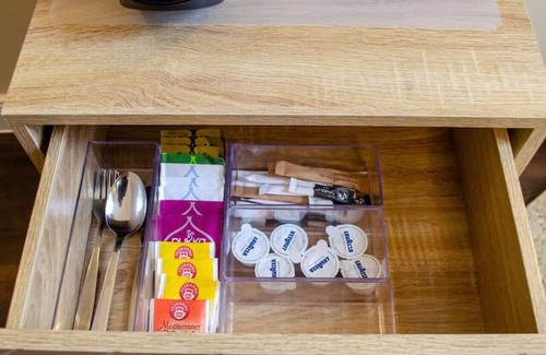 - coffee maker, kettle, dishes, cutlery, tea, coffee