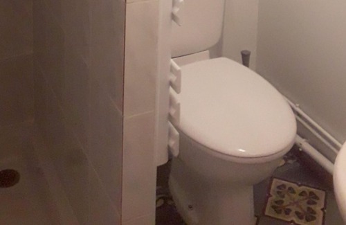 The studio has a double bed. The bathroom is fitted with a shower and a toilet.