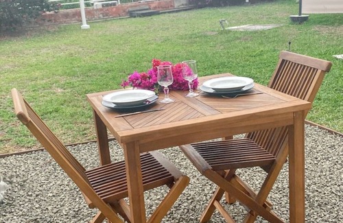 The apartment features a delightful terrace overlooking the garden, where you can enjoy your morning coffee in the sun. The common area offers an open landscape ideal for outdoor activities. Parking is available on-site, making it convenient for those arriving by car. Explore the famous surfing and hiking spots in the Caravelle reserve just a short drive away!