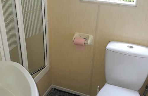 - 1 bathroom with shower and toilet.