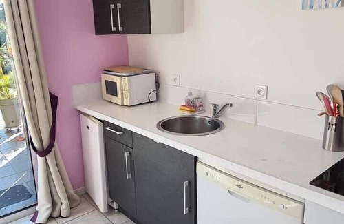 The kitchen is well-equipped for cooking up your favorite meals. Enjoy your feast around the dining table which seats 2 or outside, on the terrace.