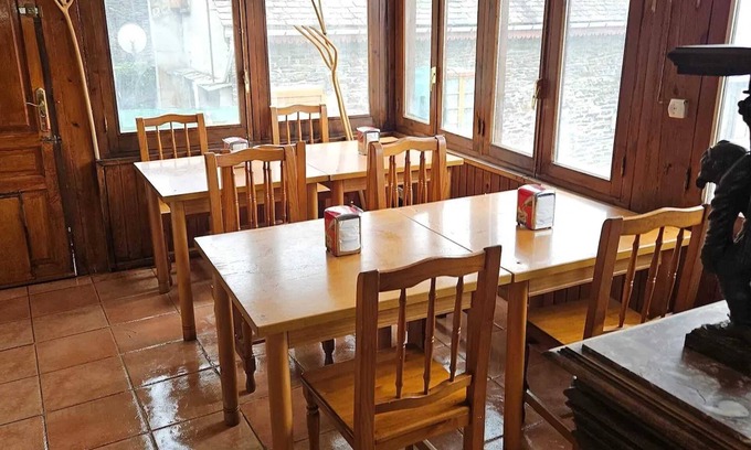 Inside, you will find a warm living space with a decorative fireplace, a comfortable sofa, and a flat-screen TV. The kitchen is fully equipped with a refrigerator, cooker, and kitchenware. The dining area invites you to share meals with family in a convivial and pleasant atmosphere.