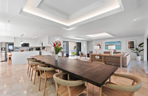 The main great room is an architectural showpiece: vaulted ceilings, natural textures, and disappearing glass walls create a fluid connection between indoor living and the open-air pool courtyard. Lounge on a designer sectional, dine under woven pendant lights, or slide open the doors to let in the ocean breeze and golden light of sunset.