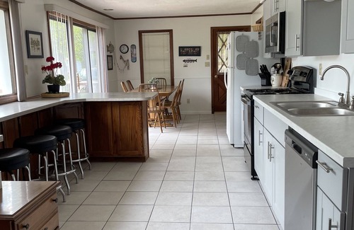 ‘Hook House’… a great get-away for the family, couples weekend, fishing trip or just a place to relax and get away from it all. ‘Hook House’ is a cozy, lakefront 1 level ranch house with 3 bedrooms in a quiet, friendly cove. Enjoy the large deck and screened in porch. This lakefront home has a beautiful lake view, a boat ramp, and an 8 slip shared boat dock with an open slip for your boat (no lift). The fishing is good and the concrete boat ramp, next to the house, offers a zero entry to the lake for getting on your raft or swimming. Use our fully equipped kitchen and charcoal grill (will need to bring charcoal) to feed your crew. Sleep 6-7 people with 1 queen, 1 double, 1 bunk bed (twin on top, double on bottom) each in their own bedrooms and a fold-out couch in the living room. Also enjoy board games or our VHS and DVD library for the TV (or bring your own), TV also accepts Amazon Fire Stick, if you have one. Washer and dryer are available in the ‘wash house’. This home, located on Maritime Lane in Roach, Mo., has provided years of lake fun for generations! Owner will be at the house to greet you upon your arrival.