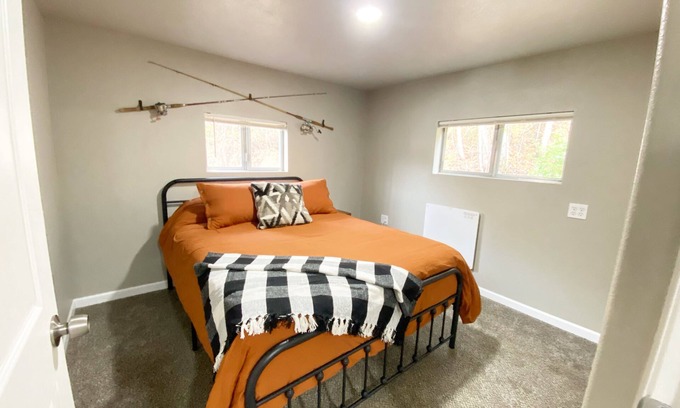Hooked on the River sleeps 6 with two bedrooms, 1 bathroom and a queen sofa bed. Smart 60” TV, Keurig coffee maker, a kitchen with all the essentials to make a meal, and a full size washer and dryer. There’s fire pit out back and patio furniture (for when the weather permits).