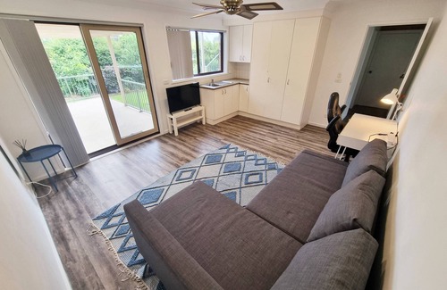 Living Ground Floor: 40 inch HD Smart TV with built in Chromecast (supports Netflix, Stan, Prime Video etc), 1 x double sofa bed that sleeps 2. This space includes a dedicated office desk and chair suitable for “Working From Home” activities. There is kitchenette with tea and coffee amenities.