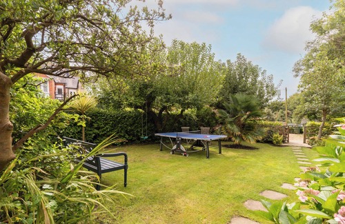 The sunny, secluded cottage-style front garden is mainly lawn with mature shrubs and hedging. It features several apple trees, including one with a children’s swing, and you can approach this area via a series of stepping stones. There are two recliner chairs and a garden bench, plus an outdoor table tennis set.