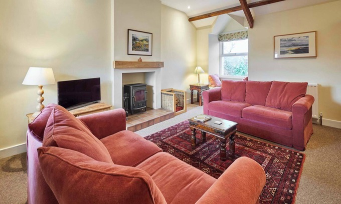 The dining area and kitchen are open plan creating a sociable feel. Leading off this area is the cosy sitting room with a log burner, two comfortable sofas and a window seat overlooking the garden. There is a cupboard of maps, books and games to enjoy and a TV/DVD player with plenty of DVDs.