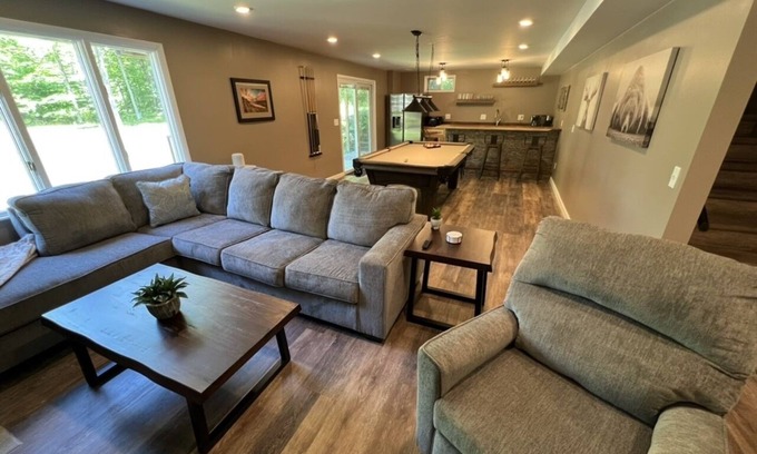 The walk out basement includes a bar (sink, full size fridge, ice, coffee maker, microwave), 4 bar stools, pool table, wood stove, couch and 86 inch internet TV. The other side of the basement features an additional queen bedroom, full bathroom (shower), and 2 desks. Indoor activities include Puzzles, cards, and board games. Speakers for music are provided in basement and living room.