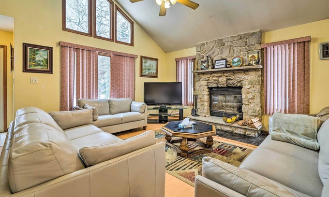 Plan the perfect mountain getaway at this 3-bedroom, 2-bath Bushkill vacation rental home, located near the famous Shawnee Mountain Ski Area and the scenic Bushkill Falls. Enjoy access to community amenities for the whole family, including tennis courts and a tranquil lake with sandy beaches, or stay at home to grill on the deck — be sure to keep an eye out for deer roaming near the backyard! In the surrounding Poconos, you’ll find everything from hiking to fishing for some outdoor adventure.