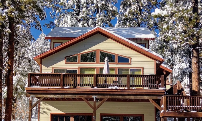 Pine Ridge Retreat is a large custom mountain home set amongst tall pine trees. The location is ideal at 8000 feet with easy access to the best that Pagosa Springs has to offer. We're 6 miles East of Pagosa, 18 miles from Wolf Creek! You can enjoy stunning views while relaxing in the hot tub or barbecue on the gas grill on our large sunny deck. This tastefully decorated home has all of the comforts and conveniences of your own home. The great room has a vaulted ceiling, a built in gas fireplace, a fully equipped kitchen and dining for 10. There are 3 full floors including a separate living area in the den with a queen futon, providing plenty of room for everyone to have privacy. Other amenities include a large master shower, a ping pong table, games and videos. We have 3 TVs in the house with Dish network satellite TV service. We have internet with a laptop provided.a Rates are seasonal. During peak times, there is a 5 night minimum.