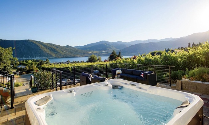 Step inside and be greeted by an inviting atmosphere, with an open layout and stunning views of the lake and vineyards from the main floor. The main living area is upstairs and offers plenty of space for relaxation and entertainment, with a cozy electric fireplace and comfortable seating. The patio provides the perfect spot for outdoor lounging and dining, with a hot tub where you can unwind and soak under the stars.