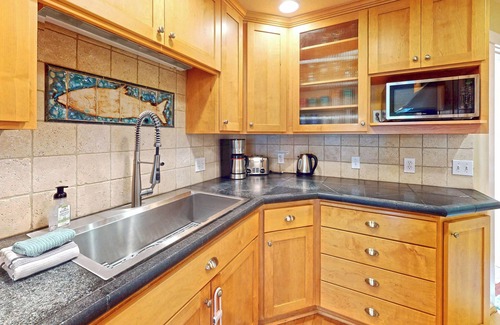 SHORE TO PLEASE at Seaside Beach: Come and enjoy this tastefully decorated two bedroom two bath home. Enter to the comforts of the formal living room where you can sit end enjoy the warmth and beauty of the gas fireplace. Then enter into the dining room that opens into the kitchen. In the kitchen you will find a Dacor gas stove, pull out drawers in the pantry, and soapstone counter tops. The kitchen is equipped with ice maker, pots, pans, dishes and silverware you will need for your stay.