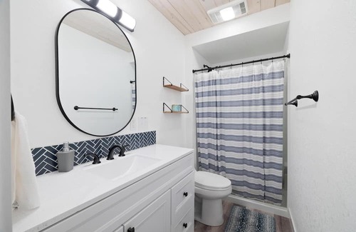 The shared bathroom provides a walk-in shower and a vanity to store your toiletries.