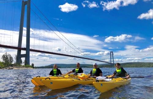 With an impressive view over the Ångermanälven River and Höga Kusten Bridge, this hotel is 328 feet from European Route E4. It provides free Wi-Fi, gym and sauna access. Härnösand is 15 mi away. All of the brightly decorated rooms at Hotell Höga Kusten feature a flat-screen TV with cable channels, as well as a desk and bathroom with a shower. Some include a private terrace. The hotel’s à la carte restaurant serves Swedish and international dishes for lunch and dinner. A café bar is also available. Guests can book an outdoor hot tub with massage features and panoramic river views. More active guests can play frisbee golf on the hotel’s course. An on-site tourist information center is available during the summer. The well-known Högakustenleden Hiking Trail starts at the hotel.