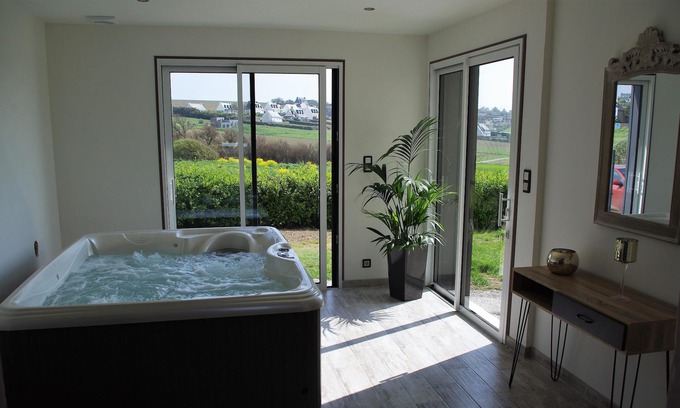 Come relax in the house Ti Avel, located at the tip of Lestrévet in Plomodiern. After a day of beach or walks, you can enjoy the relaxation area with SPA and shower room.Ti Avel is a house of great comfort for 5 people with quality services (3 bedrooms).The sea is 200 m and the beach 5 minutes walk. The house is isolated from the main road, which will ensure a quiet and relaxing holiday. In February 2018, the decoration and the layout of the house were redesigned. From the living room you can enjoy the view of the garden and the sea.