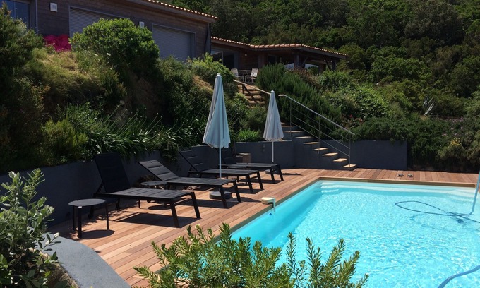 Beautiful view of the bay of Ajaccio and Sanguinaires, in the middle of the bush, flower garden not overlooked, quiet, a real little corner of paradise! House with all modern comforts, fully equipped kitchen, air conditioning, covered terrace.