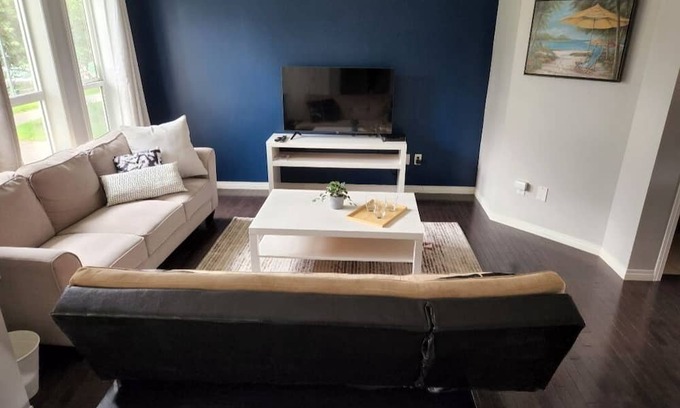 Discounts possible! Inquire. This stylish newly furnished house is located in Edmonton's family friendly neighborhood, 12-15 min from the airport, 5 min from shopping and about 8 min from South common. It's pet friendly with a fully fenced backyard, even though it's mainly one huge deck, not a big grassy area.