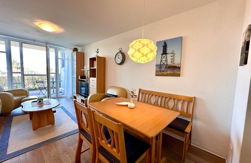 Our fully equipped comfort apartment J103 is about 53sqm in size and has 2 bedrooms (once double beds, even bunk beds), living room with dining area, satellite TV (flat screen), hi-fi system, DVD player, sep. Kitchen with dishwasher, oven and microwave, bathroom with bath, a large terrace. In the living room, children's room and in the hallway is a PVC floor. Also your dog is welcome here. WLAN is available for free. Two [nbsp] Holland bicycles can also be used free of charge. Smoking is not allowed in the apartment. Enjoy the swimming pool in the house Triton with children's pool, whirlpool and loungers. The swimming pool and the children's pool are at your disposal free of charge. The sauna is available for 4, -Euro / hour. In the period from 07. 01. - 03. 02. 2020 [nbsp] is the swimming pool and from 04. 02. - 12. 02. 2020 the sauna is closed.