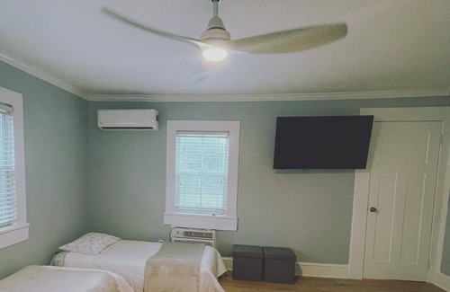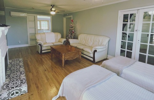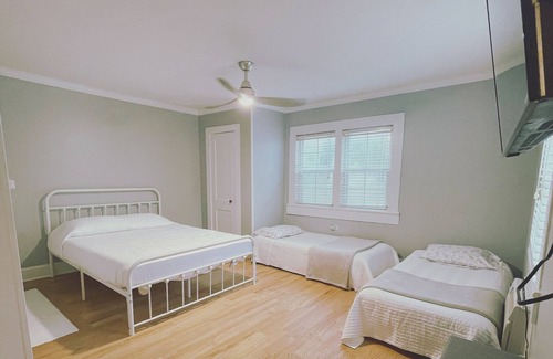 1st floor, private suite of this beautiful, semi updated home. We have been upgrading this beautiful 1940s home and have brought some of the new kitchen appliances into its vintage kitchen. Hardwood and porcelain floors. Master bedroom with a queen bed, 2 twin airbeds in closet, and a his/hers closet. The master bathroom has a stunning, long shower and his/her sink. Enormous kitchen with new elegant quartz countertops and everything you need to make your stay comfortable. Spacious living room with 2 leather couches. Fully stocked kitchen and dining table for 4. Keurig coffee maker and flavored coffee. Ceiling fans in every room. Hardwood and tile floors throughout (no carpet).