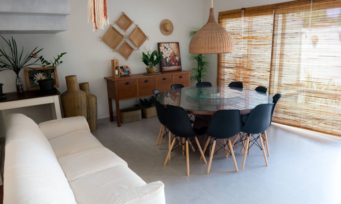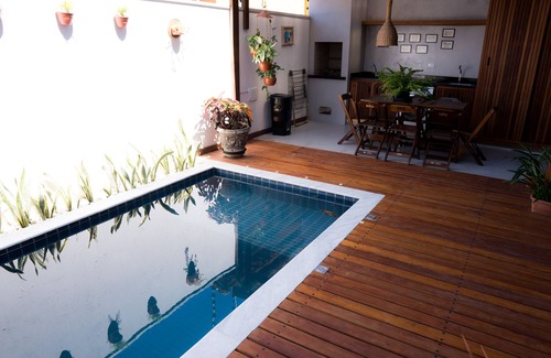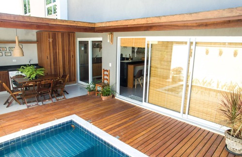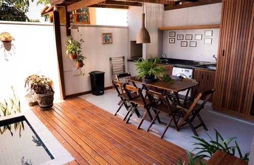House in Arraial D Ajuda - BA for rental / season. Rua dos Ipes 111 cs 02. Next to Mucugê street - 150m (Morocha). Near the beach, approximately 500m. Close to bakery, supermarket, restaurants etc. There are 04 suites, capacity for 12 people. Integrated living room, dining room and kitchen. Gourmet covered area, barbecue, swimming pool, toilet / external bathroom. Service area with washing machine. Covered garage. Appliances and complete home appliances. Air conditioning in all bedrooms and living room