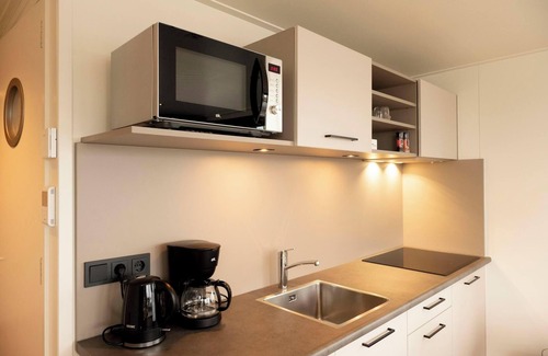 The kitchenette is fully equipped for effortless cooking, featuring a hob, combi microwave, dishwasher, and fridge-freezer. Preparing meals on this houseboat is simple, and you can start your mornings with a fresh cup of coffee or tea using the provided coffee maker and kettle.