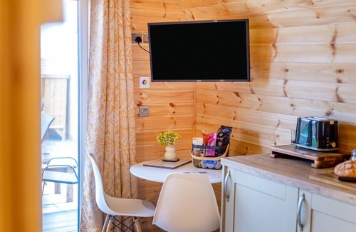 Beneath the characterful wooden exterior, you’ll find a haven of homely charm in the open-plan lounge/kitchen/dining/sleeping layout encompassing this sophisticated pod. Country cottage-style décor will capture your imagination, beckoning you to rustle up something delicious with your new local flavours in the well-equipped kitchen. The enchanting wood cladding immerses you in the peaceful, rolling countryside scenery surrounding you, setting a truly peaceful ambience perfect for unwinding at the end of a day’s adventure. The quaint dining set is perfectly placed for enjoying your wonderful countryside vistas. Wash off a long day on the local trails in the contemporary shower room before retiring to the soothing double bed nestled in a quiet spot at the back of the pod.