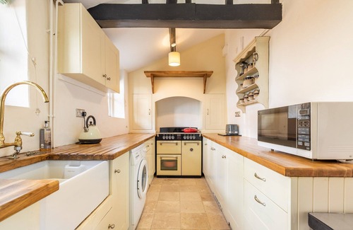 The fully equipped kitchen is stocked with many utensils and amenities including a fridge-freezer, Rangemaster oven, hobs, butler sink and washing machine. Through from the kitchen is the dining room with table seating for 6 (with use of 2 additional fold up chairs kept under the stairs).